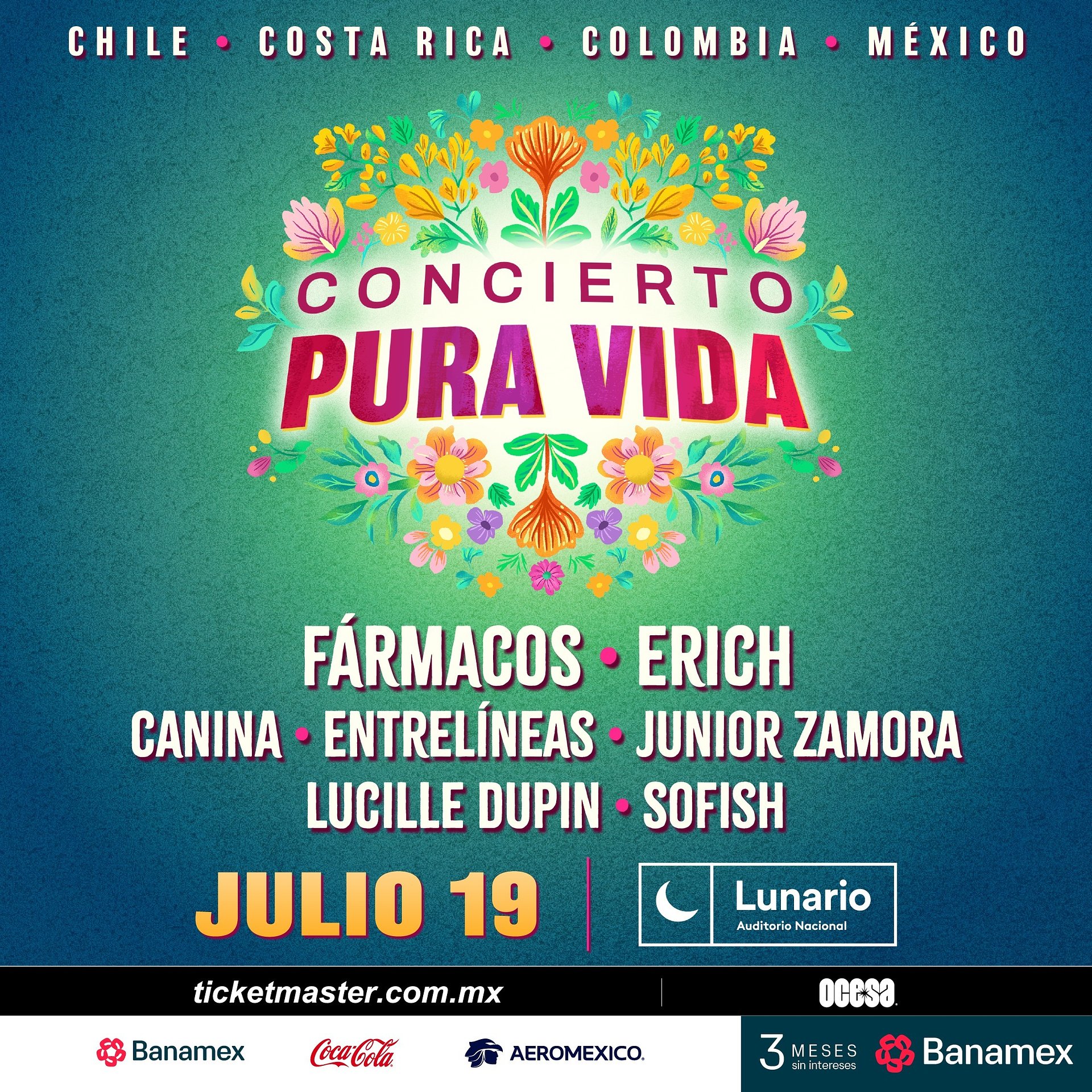 Desde Chile, Colombia, Costa Rica y México llegan artistas que no solo representan la diversidad de sonidos de nuestra región, sino que también ponen en alto nuestras raíces y emociones con cada acorde. En el escenario estarán Fármacos, Erich, Canina, Junior Zamora, Sofish, Lucille Dupin y la banda Entrelíneas, en una velada que promete hacer vibrar cada rincón del Lunario.
