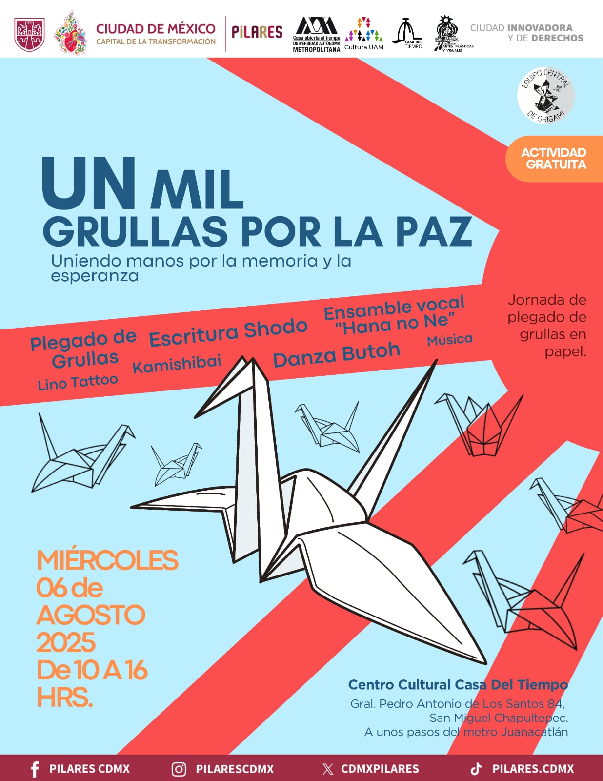 El Centro Cultural Casa del Tiempo unirá esfuerzos con la Coordinación Académica de Artes Plásticas y Visuales de PILARES Cultura, perteneciente al Subsistema de Educación Comunitaria en Ciudad de México y su equipo central de origami para mostrar su compromiso con la cultura de paz, la memoria y la construcción comunitaria.