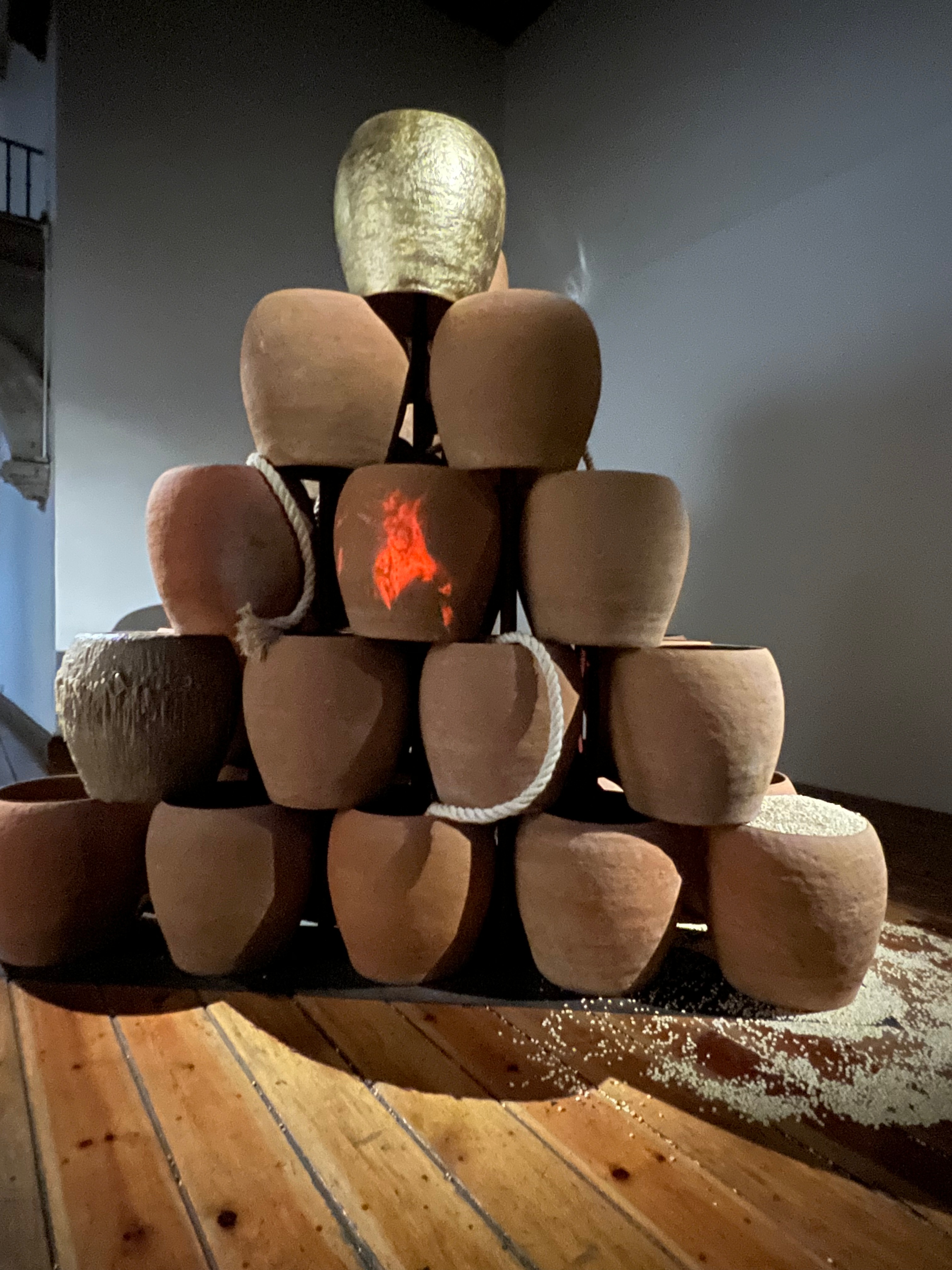 Cayaca dee [se hace polvo]. Instalación donde una olla se pulveriza con su propio movimiento, su destrucción evoca a la pérdida de los conocimientos que le dieron forma y regresa a la tierra lo que de ella tomó prestado