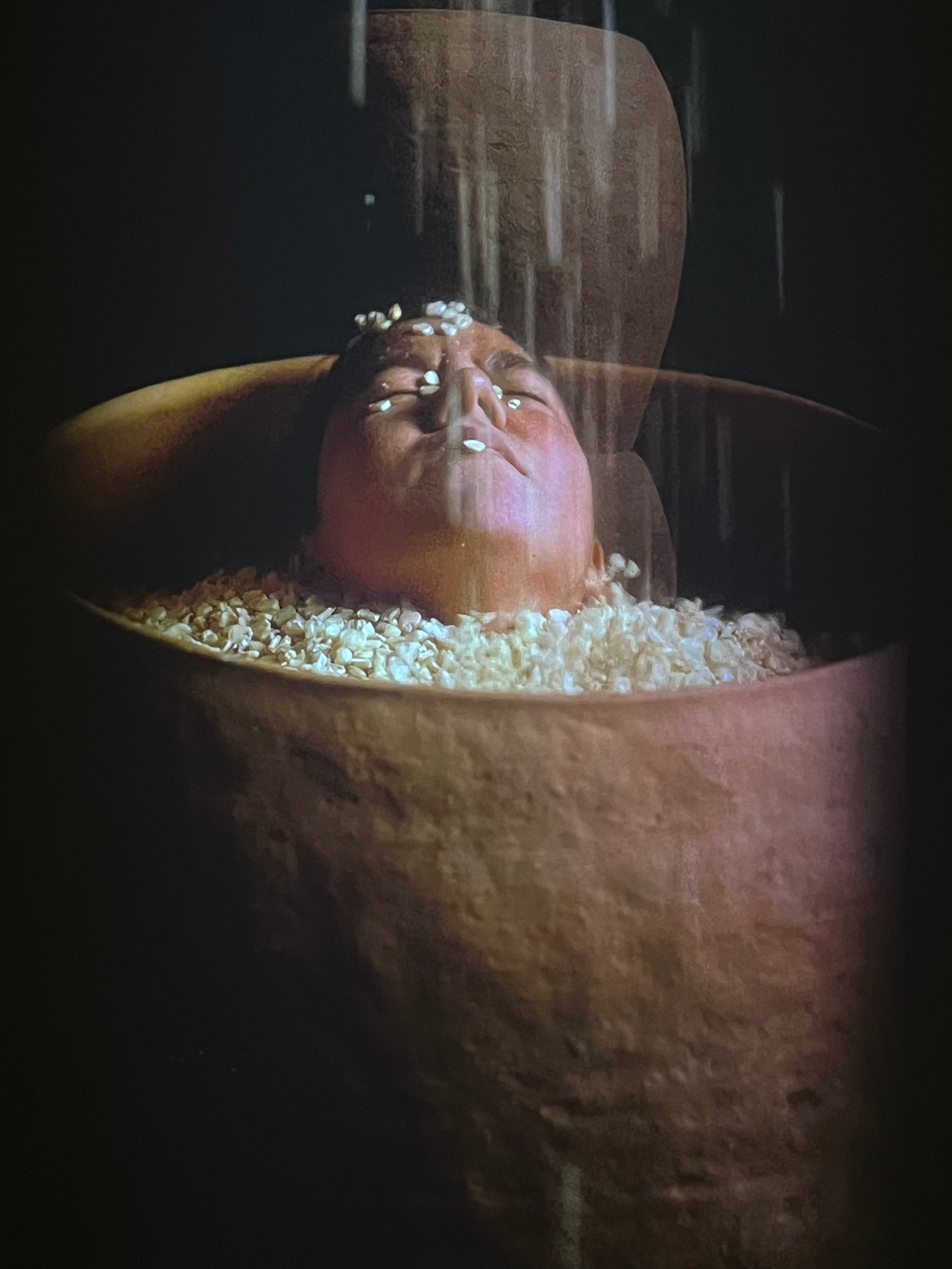 La Promesa, video instalación donde la artista Ana Hernandez se entierra dentro de un tótem de comixcales para realizar un acto ritual que vincula al cuerpo con el sustento y los ciclos agrícolas