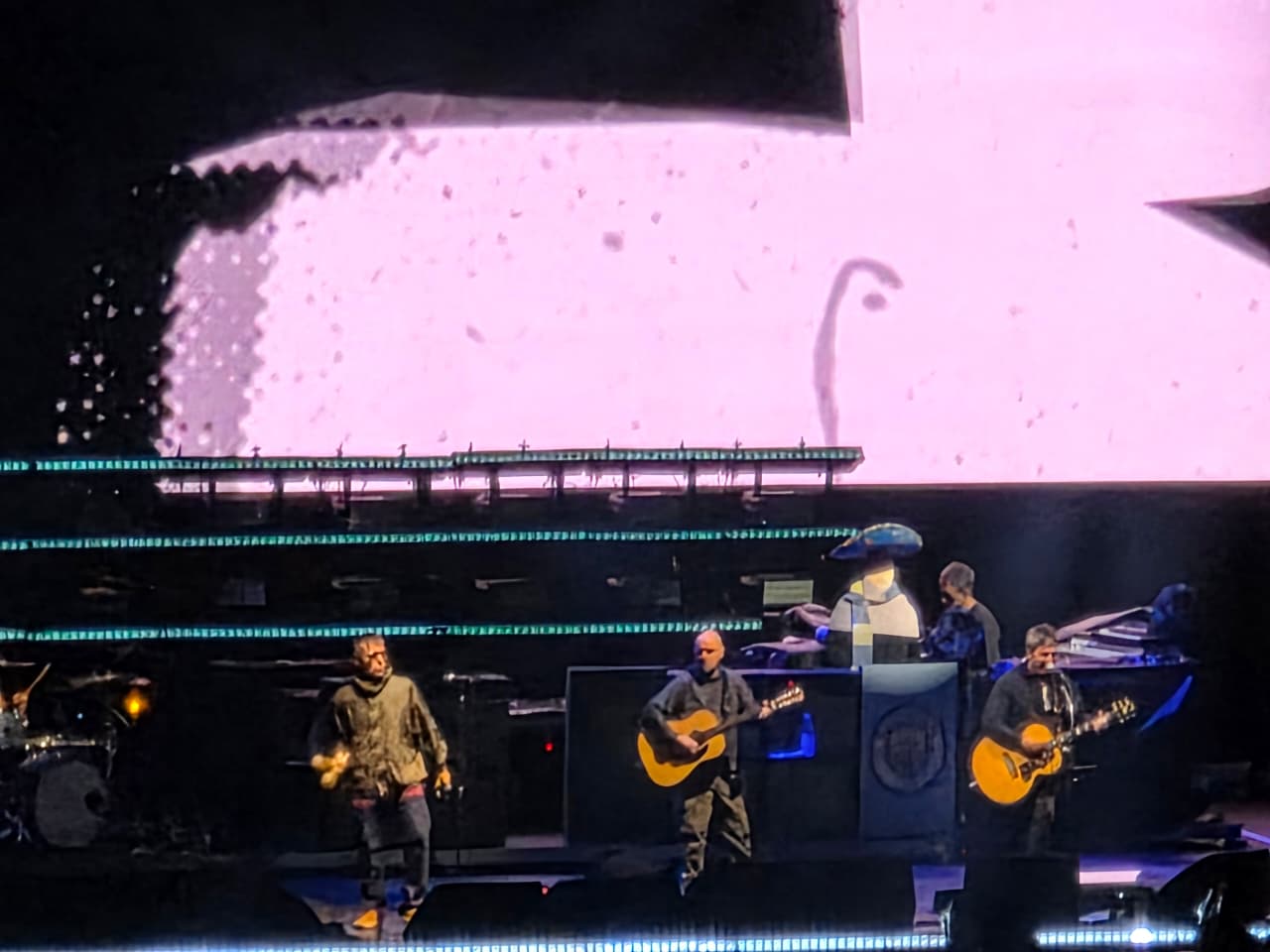 A las 9 en punto, puntuales como buenos ingleses, el cielo se despejó, las luces se apagaron y en las pantallas gigantes comenzaron a aparecer los encabezados de prensa que anunciaban el gran regreso de Oasis, mientras los acordes de Fuckin’ in the Bushes llenaban cada rincón del estadio.