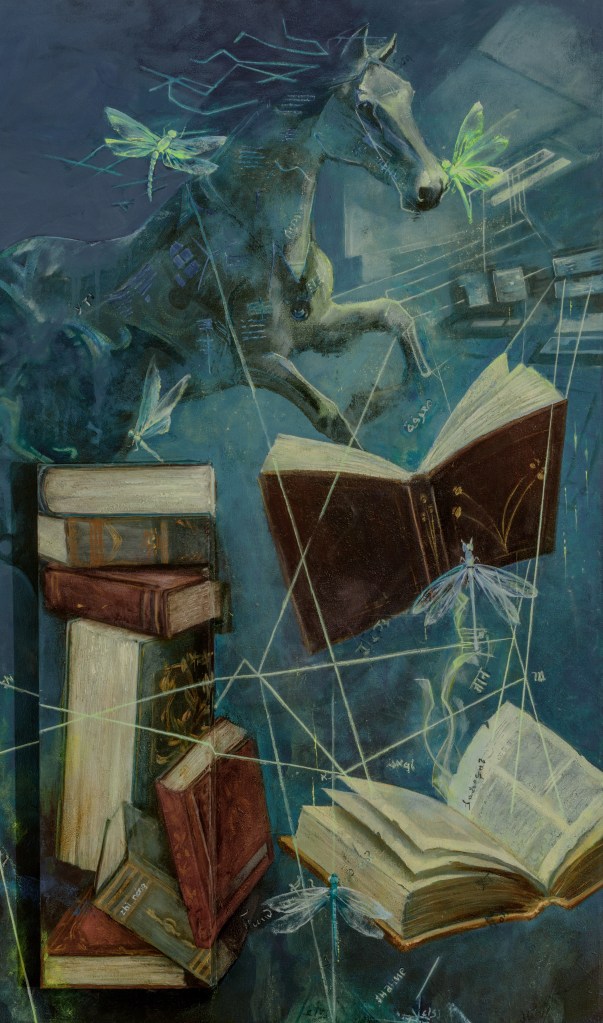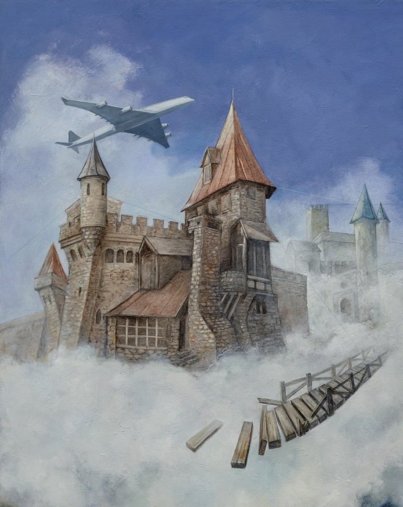 Así, en los lienzos de la artista, figuras medievales conviven con arquitecturas futuristas, jinetes simbólicos y paisajes que emergen entre la memoria y la profecía.