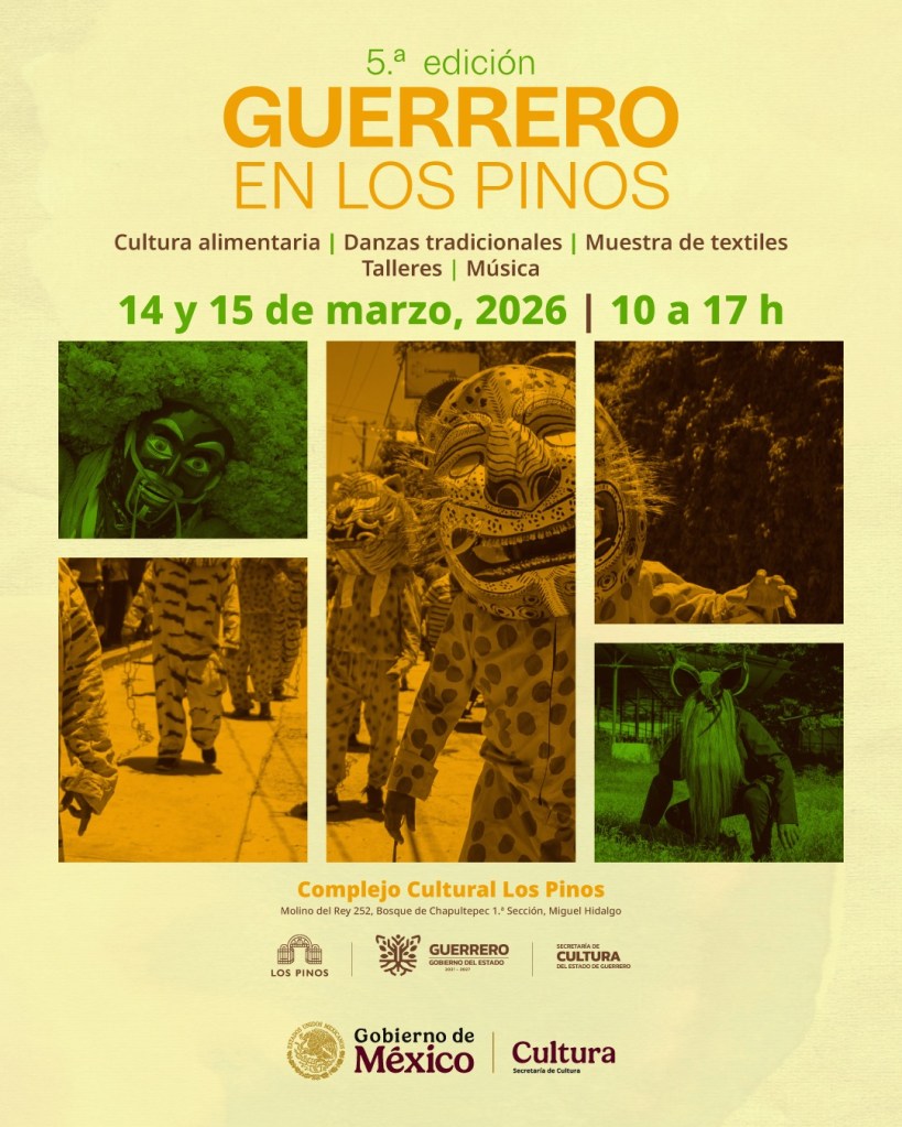 La Secretaría de Cultura del Gobierno de México, a través del Complejo Cultural Los Pinos, y el Gobierno de Guerrero, han dado a conocer la quinta edición de Guerrero en Los Pinos que se llevará a cabo los días 14 y 15 de marzo de 2026, de 10 a 17 h, con un programa especial que incluye danzas tradicionales, muestra de textiles, talleres, música y gastronomía tradicional de la entidad del sur de México.